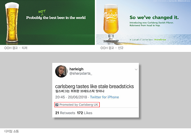 50년을 사용해 온 브랜드 태그라인, Probably the best beer in the world [아마도 세계 최고 맥주일 것입니다.]를 소구하다 폭망각에 접어든 위기의 브랜드 칼스버그. 세계 최고 맥주라는 자부심에 소비자들은 오줌 맛 맥주, 할머니가 빠져 죽은 목욕물 맛과 같은 자극적인 표현으로 비난 트위터 확산이 일어났습니다.