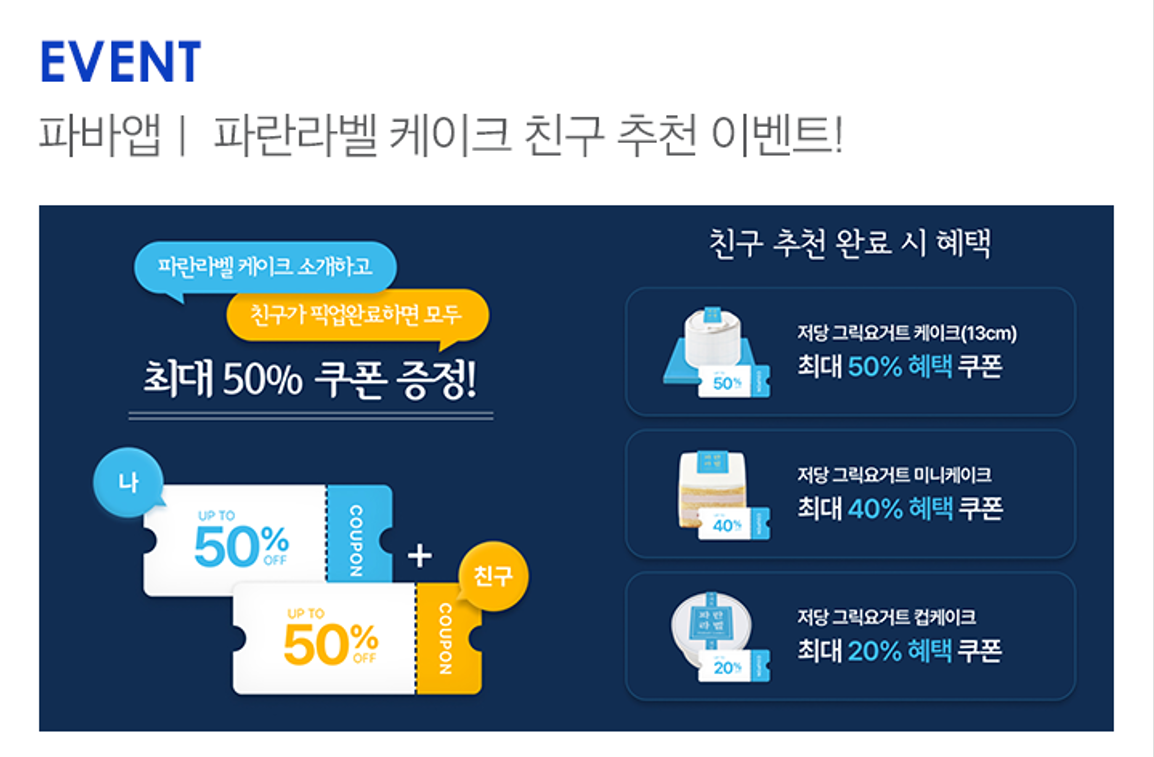 저당 그릭요거트 케이크, 미니케이크, 컵케이크를 친구에게 추천하고 주문을 하면 상품별로 쿠폰을 드리고 있어요!