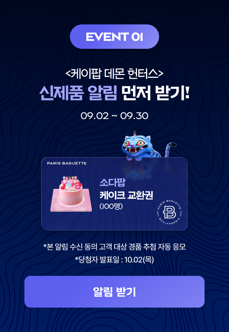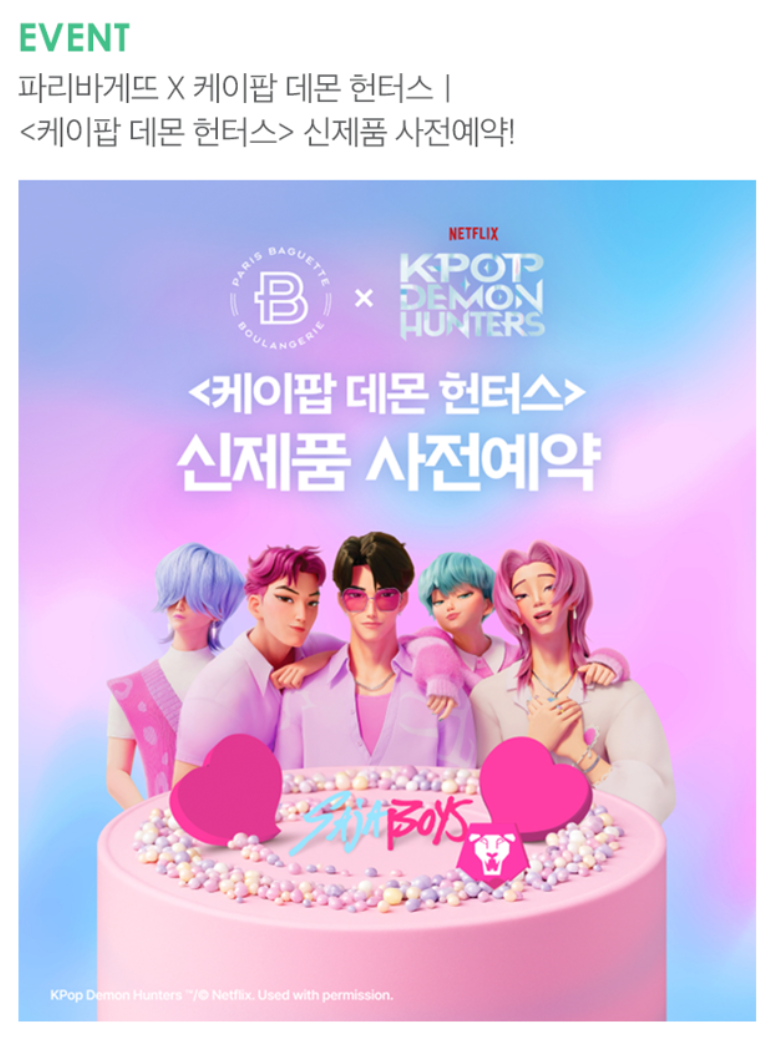 파리바게뜨가 넷플릭스의 영화 <케이팝 데몬 헌터스>와 공식 협업을 하여 <케이팝 데몬 헌터스>가 지닌 독창적인 세계관과 K팝의 폭발적인 파급력을 K베이커리에 접목한 창의적인 제품 라인업을 선보입니다.